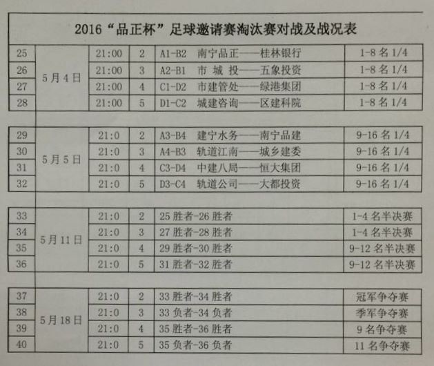 1/4淘汰賽將于5月4日進行,分別由A組第一南寧品正對B組第二桂林銀行、A組第二市城投對B組第一五象投資、C組第一市建管處對D組第二綠港集團、C組第二區(qū)建科院對D組第一市城建咨詢。