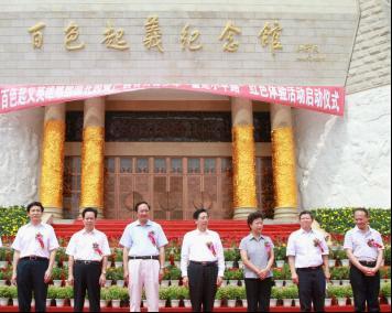 6月28日下午,百色市百色起義紀(jì)念館廣場(chǎng)紅旗招展,紅歌激揚(yáng),百色起義英雄雕塑園開(kāi)園暨廣西百萬(wàn)青少年“重走小平路”紅色體驗(yàn)活動(dòng)啟動(dòng)儀式在這里隆重舉行。廣西自治區(qū)黨委書(shū)記、自治區(qū)人大常委會(huì)主任郭聲琨出席儀式,并與自治區(qū)黨委副書(shū)記陳際瓦,自治區(qū)黨委常委、秘書(shū)長(zhǎng)余遠(yuǎn)輝一道,共同為團(tuán)干部、青聯(lián)委員、青年文明號(hào)集體代表、少先隊(duì)員等青少年“重走小平路”團(tuán)隊(duì)代表授旗,陳際瓦宣布百色起義英雄雕塑園開(kāi)園、“重走小平路”紅色體驗(yàn)活動(dòng)啟動(dòng),嘹亮的軍號(hào)響徹廣場(chǎng)上空,正式拉開(kāi)了“重走小平路”紅色體驗(yàn)活動(dòng)的序幕。