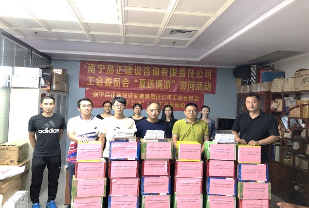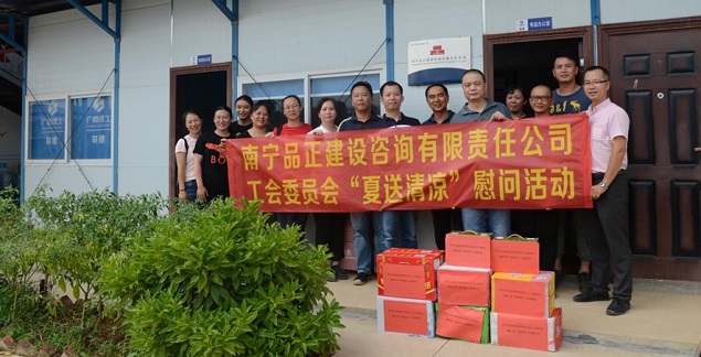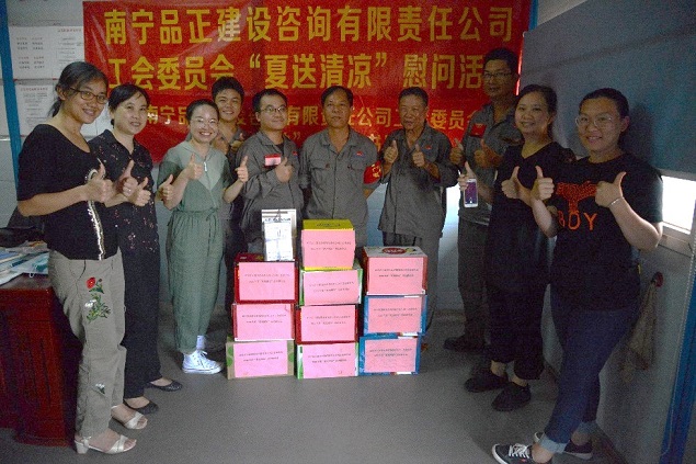 炎炎夏日,高溫持續(xù),大家都陷入了“蒸桑拿”的模式,環(huán)衛(wèi)工人、農(nóng)民工的艱辛受到了社會大眾的關(guān)注。有這么一群人,他們同樣不畏高溫,不怕酷暑,在“桑拿”的天氣下,依舊堅守在崗位上,他們就是堅守一線監(jiān)理崗位的員工。近日,由南寧品正建設(shè)咨詢有限責(zé)任公司工會委員會組織,公司總經(jīng)理羅順華、副總經(jīng)理蘇艷、工會主席梁秋霞以及工會委員組成的慰問小組深入基層項目,慰問頂著烈日、堅守崗位的一線監(jiān)理員工,給他們送去絲絲涼意和滴滴關(guān)愛,讓他們在炎炎夏日中感受到公司工會“娘家人”對他們的關(guān)心。