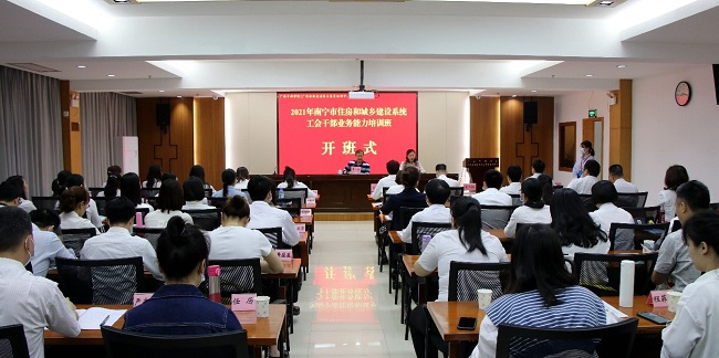 為強化理論武裝,把牢正確政治方向,提高工會干部的整體素質(zhì)水平,2021年3月29日—4月2日,南寧市住房和城鄉(xiāng)建設(shè)系統(tǒng)工會干部業(yè)務(wù)能力培訓(xùn)班在廣西干部學(xué)院隆重開班,來自建設(shè)行業(yè)的20多家企業(yè)的工會主席和工會干部共60人參加了本次為期五天的培訓(xùn)。南寧市建設(shè)工會顧問黃少古同志在開班儀式上作重要講話。
