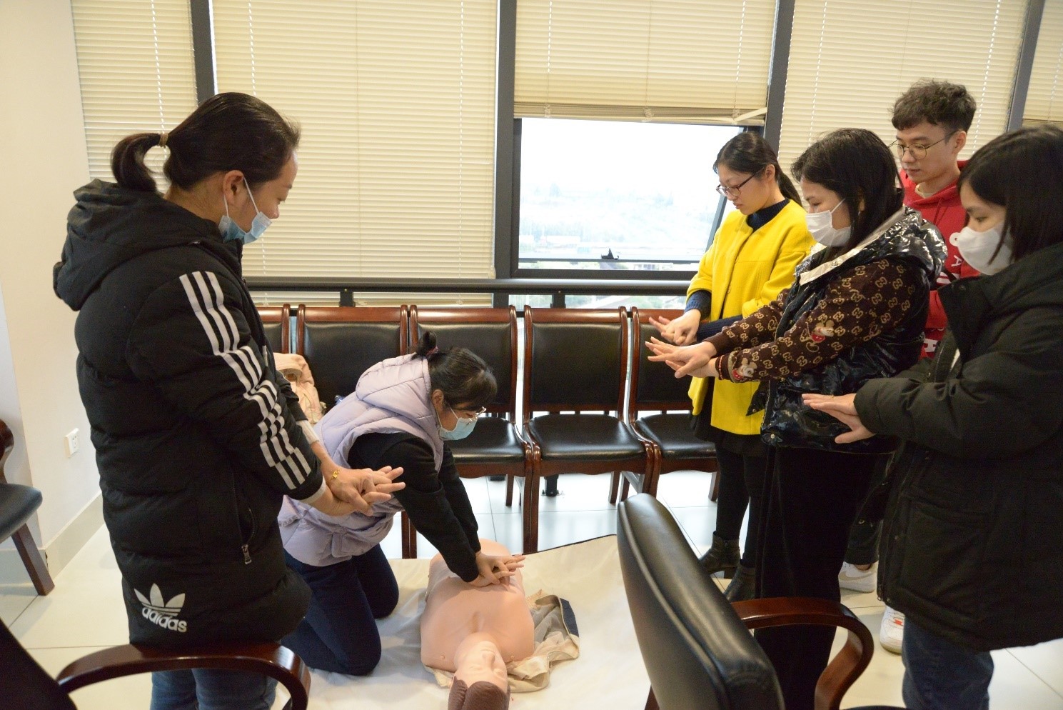 授課現(xiàn)場,培訓(xùn)老師緊扣應(yīng)急救護(hù)重點,闡述了心肺復(fù)蘇(CPR)的理論知識和重要性,系統(tǒng)講解、全程展示啟動應(yīng)急反應(yīng)和CPR的全操作流程,操作步驟及注意事項,并使用教具分步演示了如何判斷呼吸、打開氣道以及實施胸外心臟按壓等急救手段,并進(jìn)一步普及了AED(自動體外除顫儀)的獲取及使用方式,通俗易懂,生動形象。