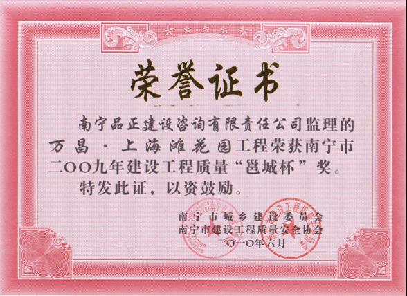 2010年6月,南寧品正負(fù)責(zé)監(jiān)理的南寧市南站南側(cè)路工程C標(biāo)、E標(biāo)、南寧市江南堤路園項(xiàng)目市政工程道路施工1#標(biāo)、南寧市精品線路綜合整治工程(一期)B標(biāo)、南寧市五象廣場周邊區(qū)域市政設(shè)施綜合整治工程I標(biāo)工程、南寧市五象廣場周邊區(qū)域市政設(shè)施綜合整治工程I標(biāo)、南梧大道工程(高速環(huán)二塘收費(fèi)站到三塘下丹橋)NO.7標(biāo)段、萬昌·上海灘花園工程、廣西明陽工業(yè)園啟動(dòng)區(qū)道路工程III標(biāo)等多個(gè)工程分別榮獲南寧市城鄉(xiāng)建設(shè)委員會(huì)、南寧市建設(shè)工程質(zhì)量安全協(xié)會(huì)頒發(fā)的南寧市2009年建設(shè)工程質(zhì)量“邕城杯”獎(jiǎng)。